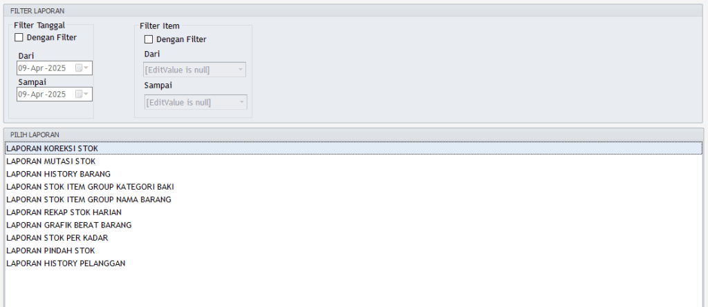 Silahkan buka modul menu sebelah kiri STOK -> LAPORAN STOK. Kemudian akan tampil daftar laporan. Pilih pada laporan koreksi stok dan sesuaikan filter rentang tanggal dan rentang barang apakah user ingin melihat semua tanggal input koreksi stok atau range tanggal tertentu dan atau user ingin melihat di antara rentang barang tertentu yang di koreksi. Jika user ingin melihat seluruh data koreksi stok yang tercatat maka filter rentang tanggal dan filter rentang barang jangan di centang. gambarang detail filter seperti gambar di bawah ini:.