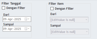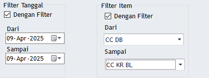 Tetapi jika ingin melihat data koreksi stok dengan range tanggal dan atau barang tertentu maka silahkan centang filter tanggal dan pilih range tanggal tertentu dan atau centang filter barang dan pilih range barang tertentu seperti gambar di bawah ini: