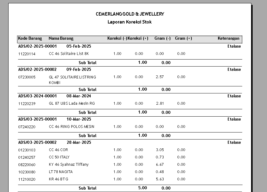 Hasil yang diperoleh dari laporan koreksi stok adalah sebagai berikut: